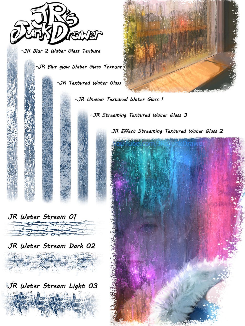 I was painting some fanart of a girl leaning against a rainy window when I made these brushes, and I show a little more of these brushes in that YouTube art tutorial, here in this video: